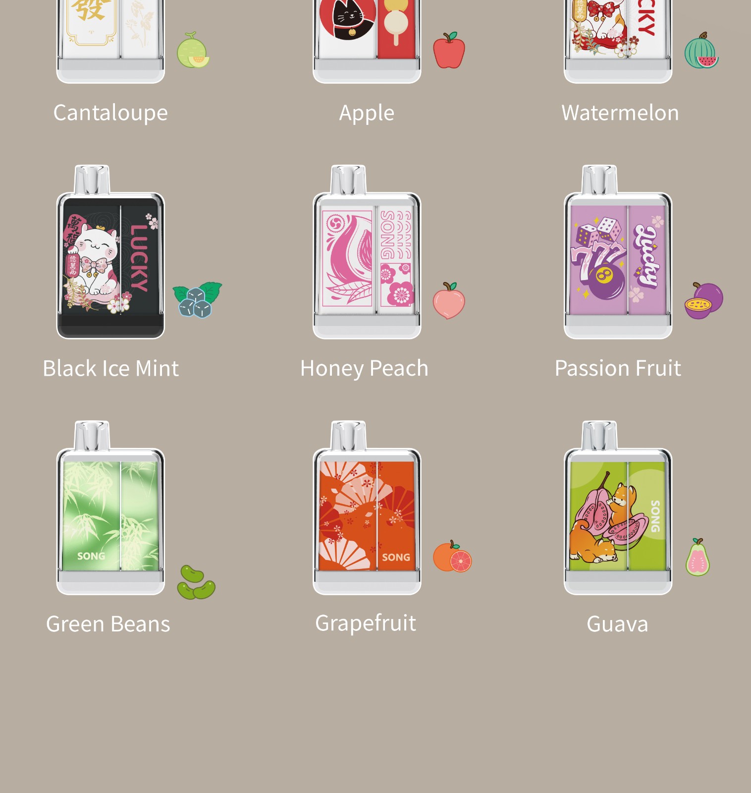 Cantaloupe/Black Ice Mint/Cola/Litchi/Longjing Tea/Lemon/Apple/Grape/Green Grape/Watermelon/Green Beans/Grapefruit/Guava